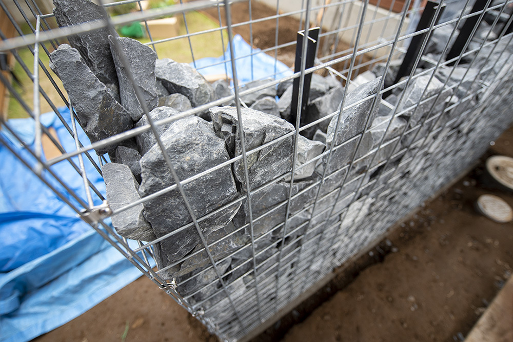 ガビオンはスチールメッシュの籠の中に石を詰めた石積で、